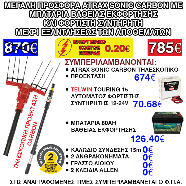 Η εταιρεία μας έχοντας λάβει υπόψιν, τις ανάγκες όλων των ελαιοπαραγωγών (ερασιτεχνών και επαγγελματιών) σας προσφέρει τώρα μια πλήρως εύχρηστη, λειτουργική και οικονομική Προσφορά Πακέτου με το ΕΛΑΙΟΡΑΒΔΙΣΤΙΚΟ ATRAX ELECTRIC SONIC