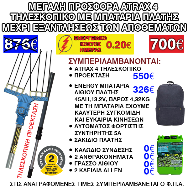 Η εταιρεία μας έχοντας λάβει υπόψιν, τις ανάγκες όλων των ελαιοπαραγωγών (ερασιτεχνών και επαγγελματιών) σας προσφέρει τώρα μια πλήρως εύχρηστη, λειτουργική και οικονομική Προσφορά Πακέτου με το Νέο Ελαιοραβδιστικό ATRAX ELECTRIC 4 ΤΗΛΕΣΚΟΠΙΚΟ (Πτυσσόμενη Προέκταση) που συμπεριλαμβάνει: