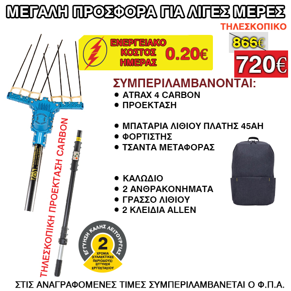 Η εταιρεία μας έχοντας λάβει υπόψιν, τις ανάγκες όλων των ελαιοπαραγωγών (ερασιτεχνών και επαγγελματιών) σας προσφέρει τώρα μια πλήρως εύχρηστη, λειτουργική και οικονομική Προσφορά Πακέτου με το Νέο Ελαιοραβδιστικό ATRAX ELECTRIC 4 CARBON ΤΗΛΕΣΚΟΠΙΚΟ (Πτυσσόμενη Προέκταση) που συμπεριλαμβάνει: