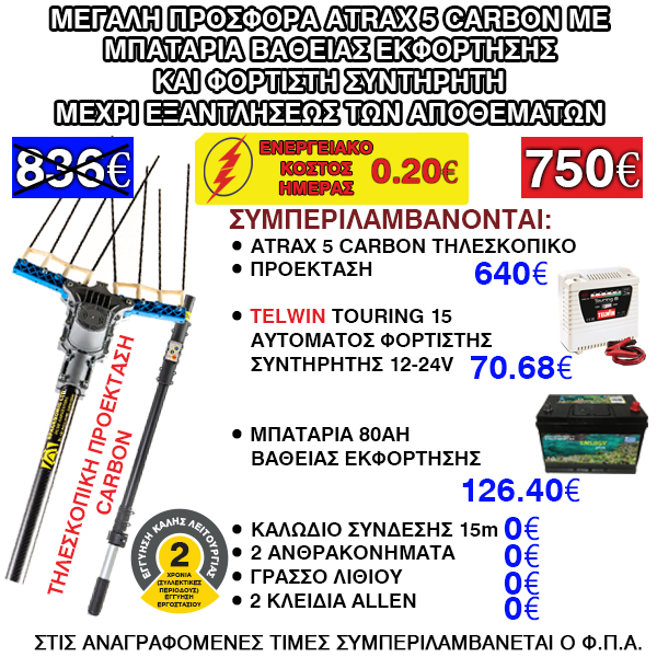 Προσφορά Σετ Atrax Electric 5 + Μπαταρία + Φορτιστής +…Atrax Electric 5 Τηλεσκοπικό με ανθρακόνημα